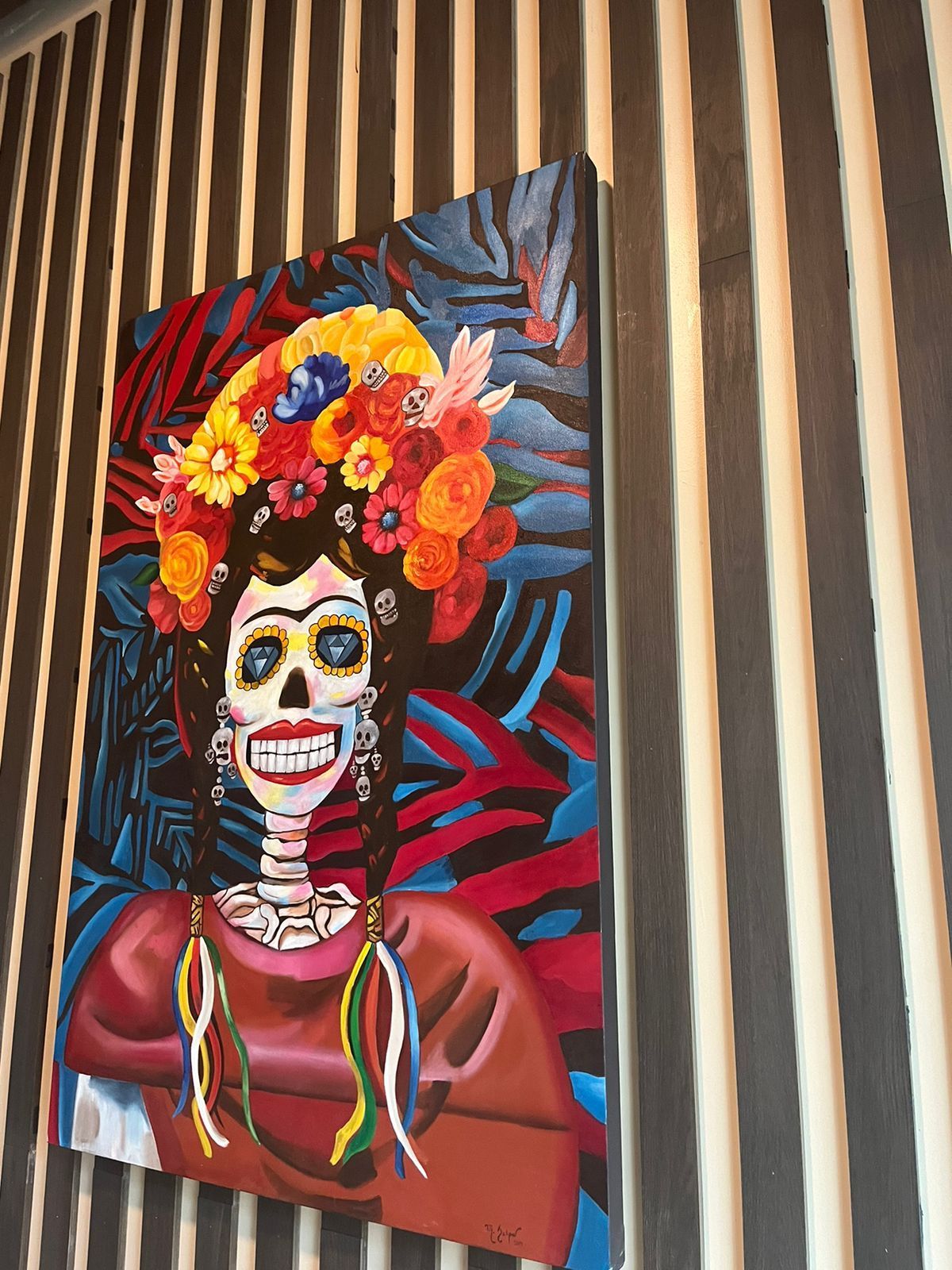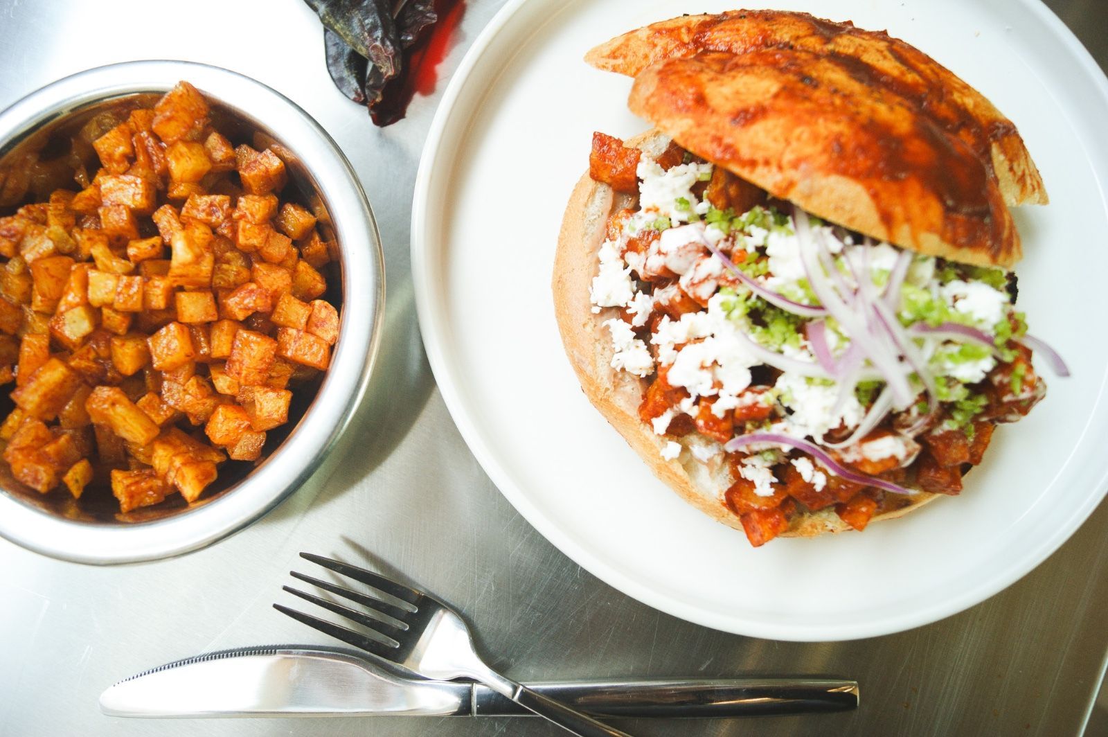 Bolillo dorado con salsa guajillo; relleno de papa, queso fresco, frijoles.
