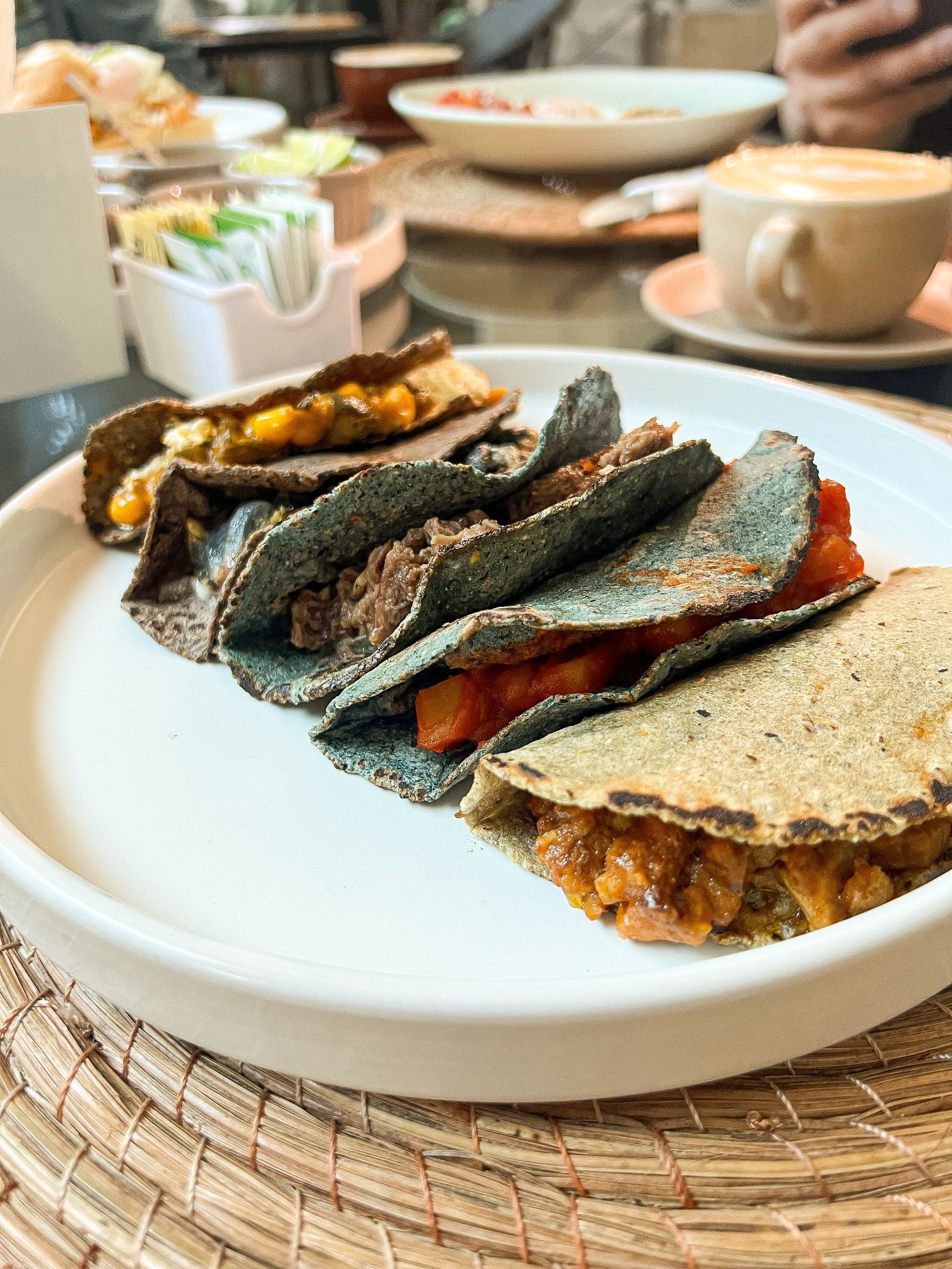 Tortilla de nixtamal recién molido y hecho en casa o tortilla de harina con guiso a elección.