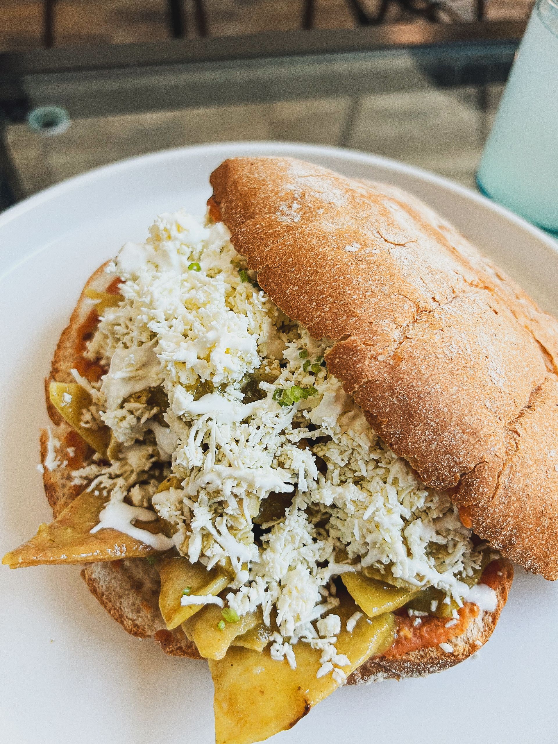 Torta de chilaquiles, salsa a tu elección, queso, crema y frijoles.