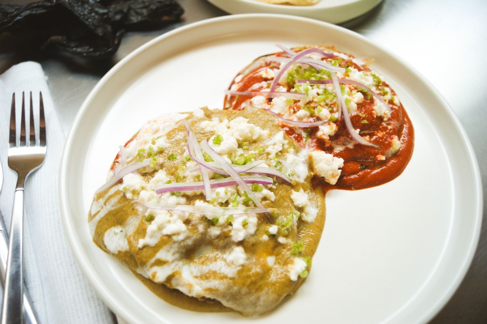 Dos huevos estrellados acompañados de dos enchiladas con papas en salsa guajillo.