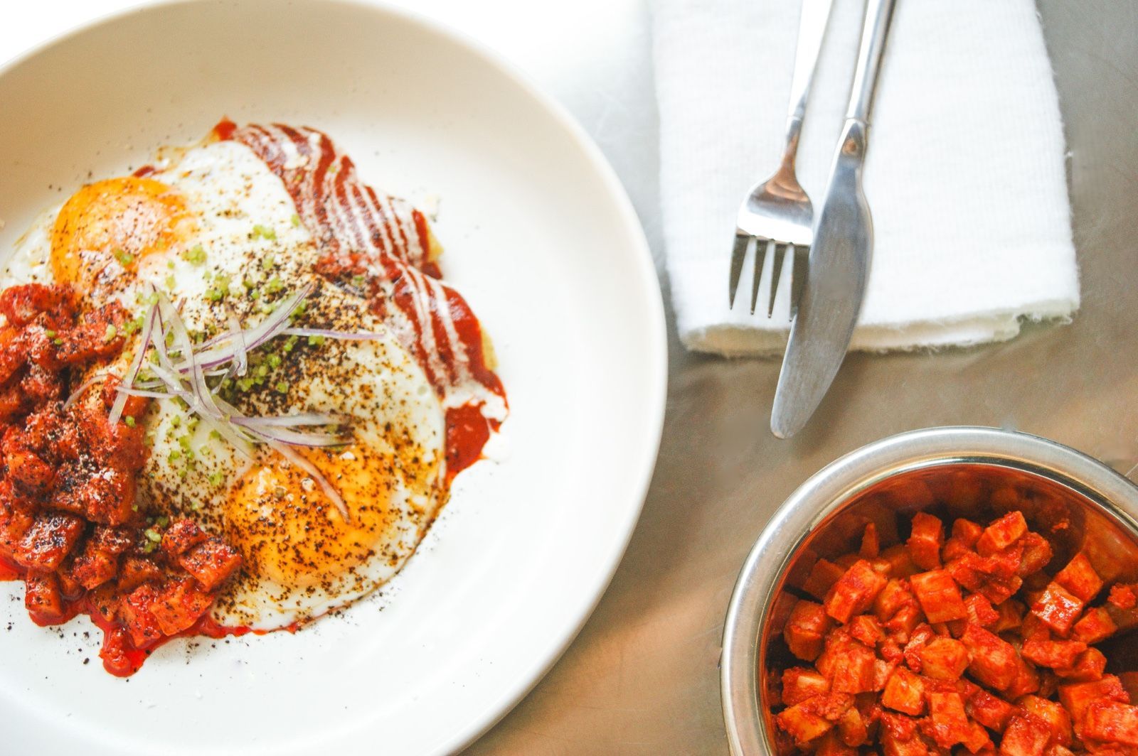 (2 huevos estrellados, tortilla, bañados en salsa roja, verde o morita)